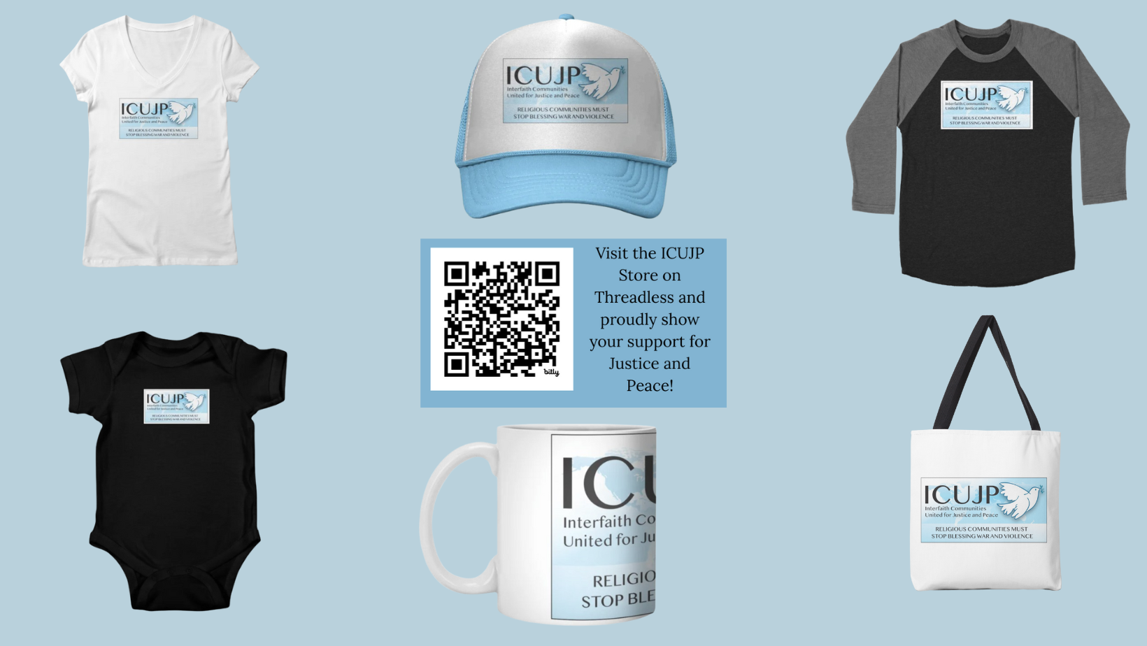 You can also visit our ICUJP Threadless Store where you can make a purchase and wear your support for our organization, or give the gift of a tote bag, a mug, or a cute little onesie so your grandkids can be fashionable!