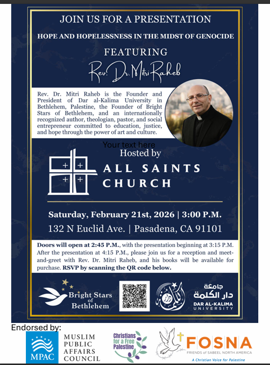 At 3pm this Saturday the All Saints Middle East Ministry will host Rev. Dr. Mitri Raheb, the President of Dar al Kalima University in Bethlehem. Dar al Kalima University emphasizes visual arts, music, drama, and other cultural means to educate and preserve Palestinian identity. Dr, Mitri's presentation is entitled Hope and Hopelessness in the Midst of Genocide.Before founding Dar al Kalima, Dr. Mitri was the longtime pastor of Christmas Lutheran Church in Bethlehem, which included the difficult days of the Second Intifada when Bethlehem was occupied and under curfew. Hei emerged from that time as a creative and resourceful community leader and social entrepreneur. He is a practical theologian, and the author of several books, including Decolonizing Palestine and Faith in the Face of Empire.This event is coordinated with Bright Stars of Bethlehem and endorsed by Friends of Sabeel, the Muslim Public Affairs Council, and by Christians for a Free Palestine.Scan the QR code on the attached flyer, register on the Bright Stars website or use this link to register for this free program: https://share.google/Vv5DqKwXz1WK9BsNt