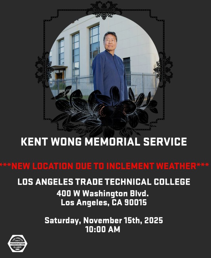 Because of inclement weather, the location for the memorial for Kent Wong on Saturday, Nov. 15th will, be changed to LA Trade Tech beginning at 10:00 am. RSVP Here.
