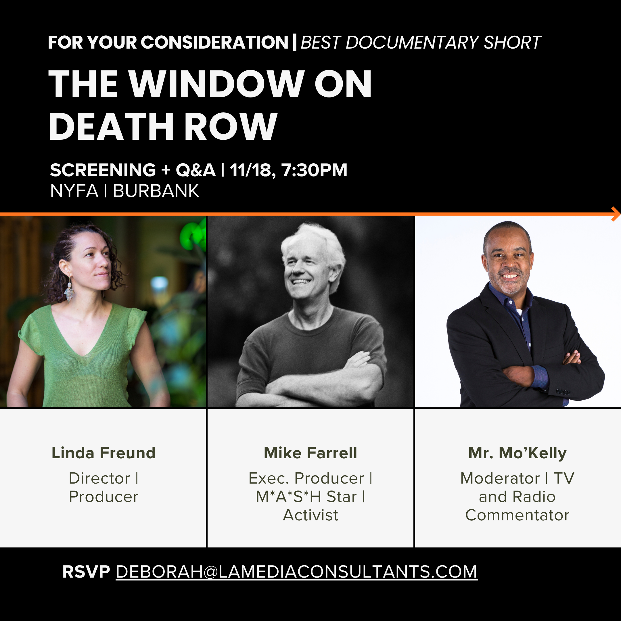 Join Director/Producer Linda Freund and Exec. Producer/Board President of Death Penalty Focus Mike Farrell at this screening of The Window on Death Row Tuesday, Nov. 18th at the New York Film School, 3300 W Riverside Dr, Burbank, CA 91505. Q&A to follow.